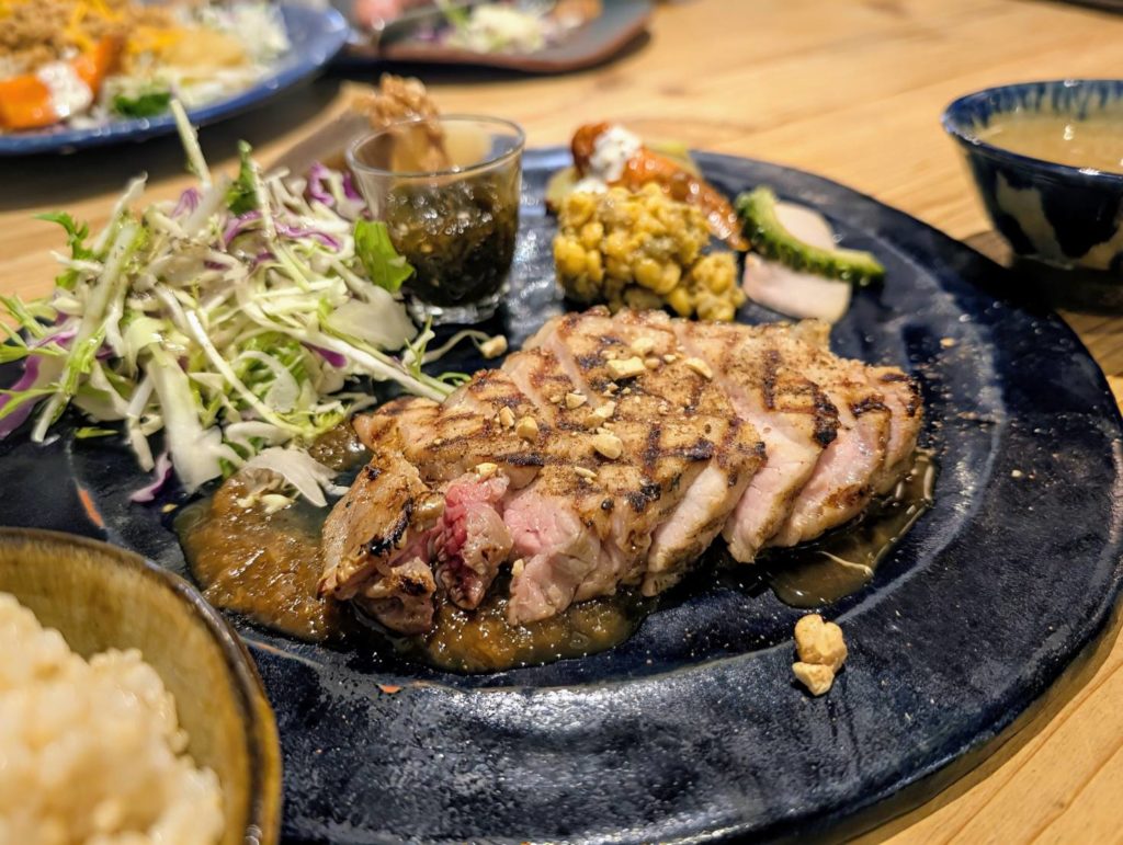 可愛らしくも落ち着いていて、足を踏み入れやすいお店。県産食材を使って作られたメニューは、日常にも登場するおかずだけど、こちらで頂くとご馳走になる。おすすめはお店の名前にもついているピパーチ(島胡椒)を使ったジューシーで肉の旨味たっぷりのハンバーグ。